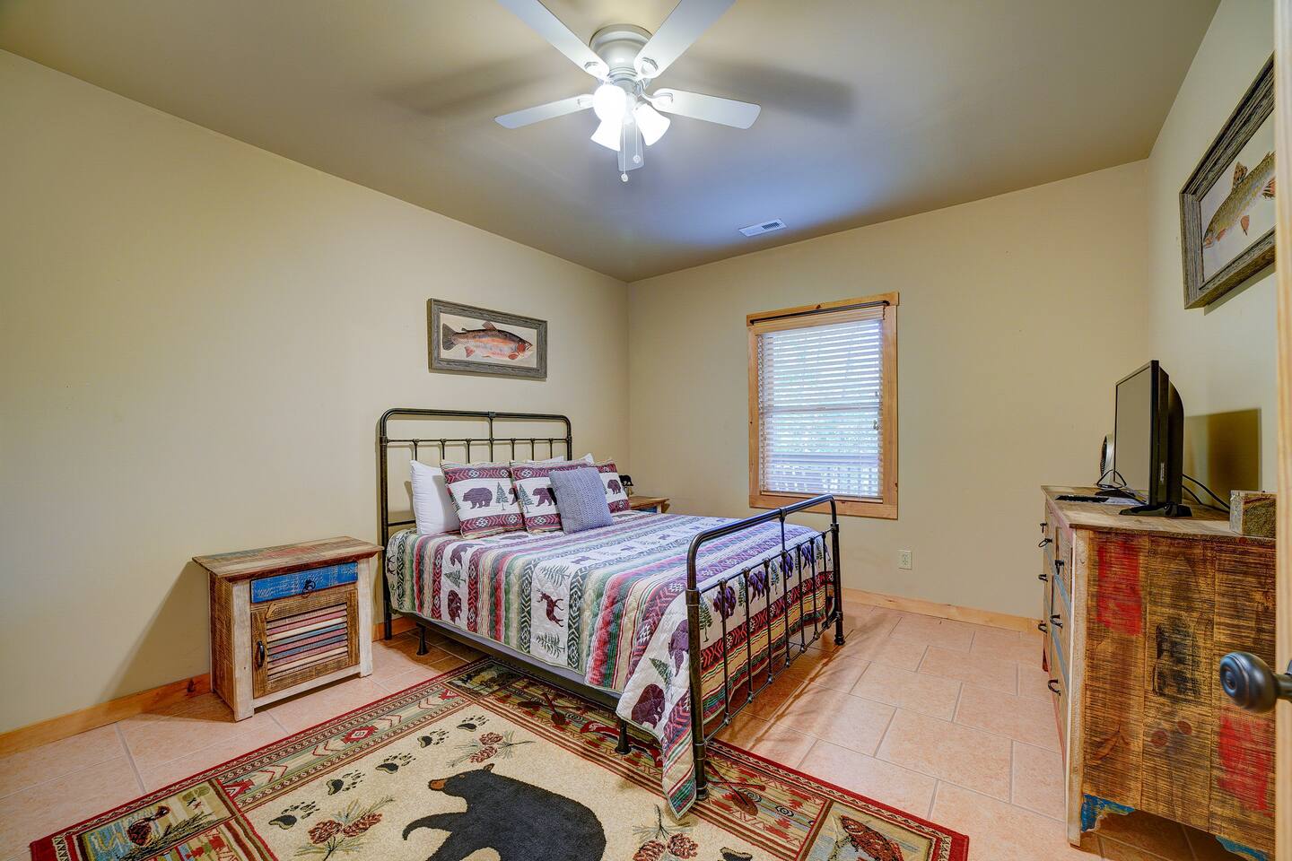 • Downstairs bedroom with a queen bed, 42” Smart TV, and a relaxing rug for added comfort.