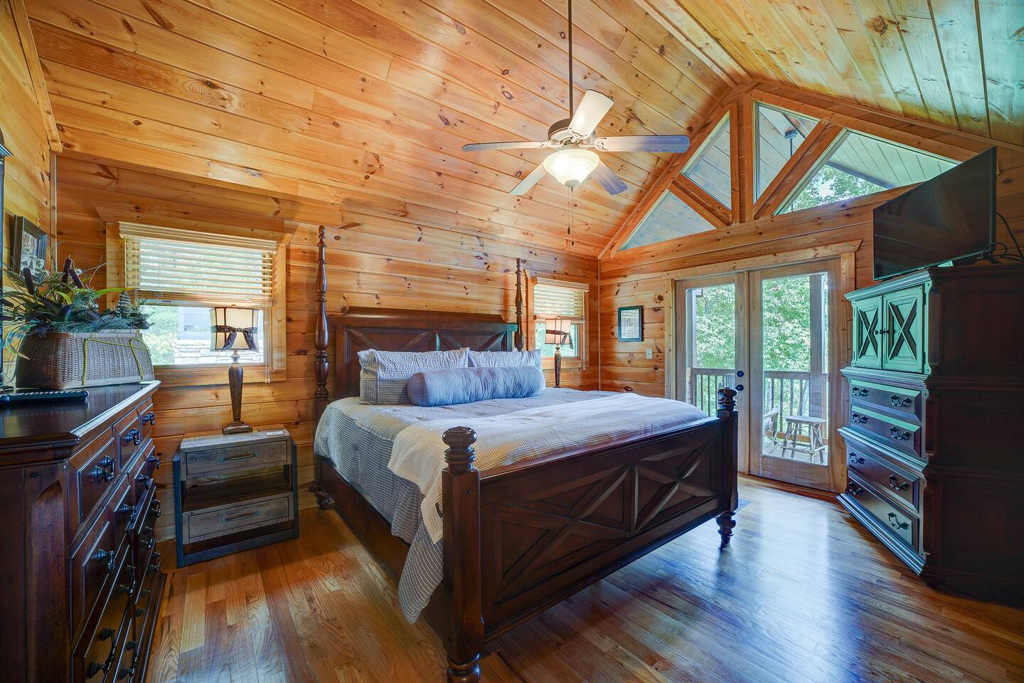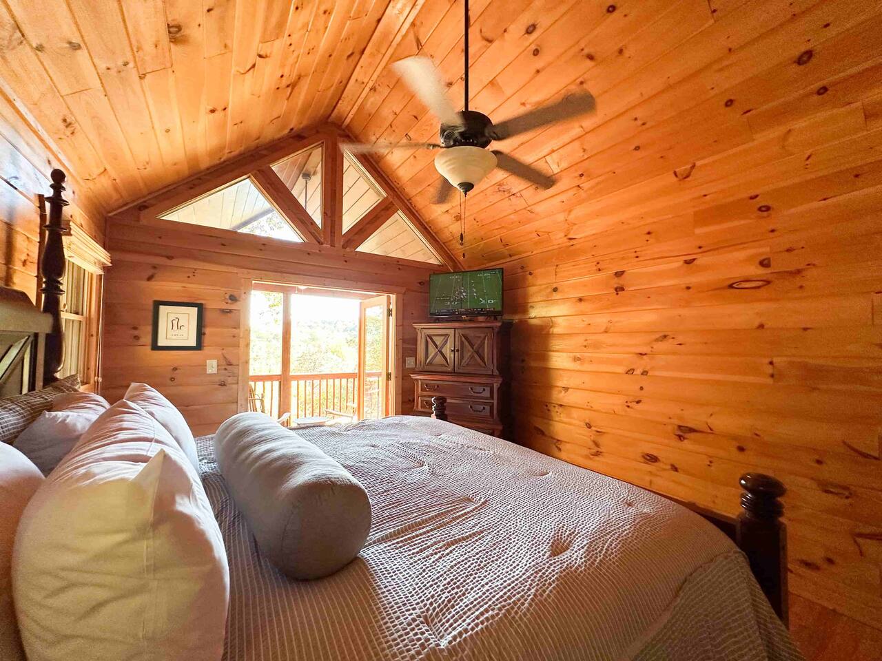 • Upstairs master bedroom with a king bed, 42” Smart TV, and private deck access.