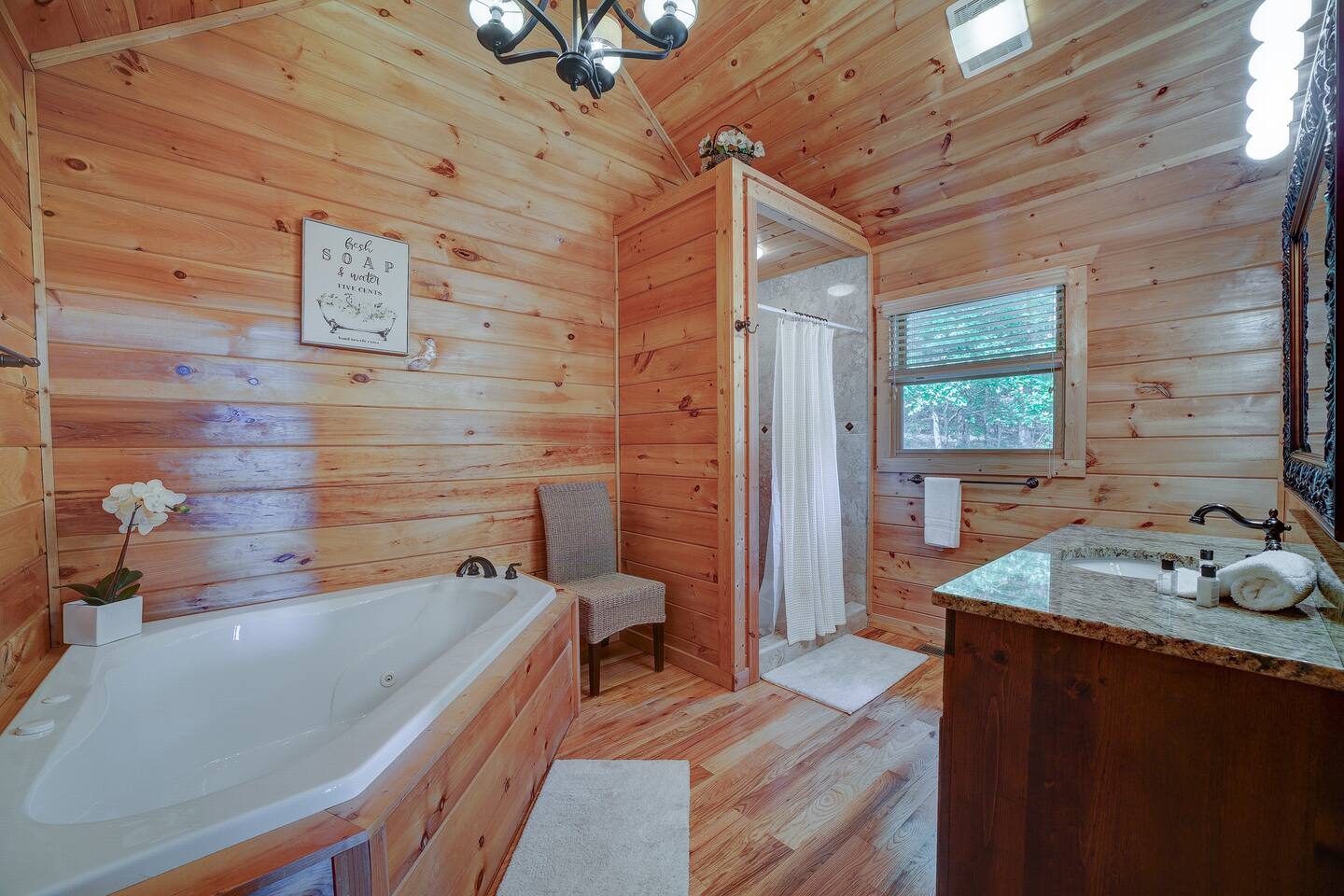 • Upstairs master bath with a walk-in shower, jetted tub, and granite top vanity.