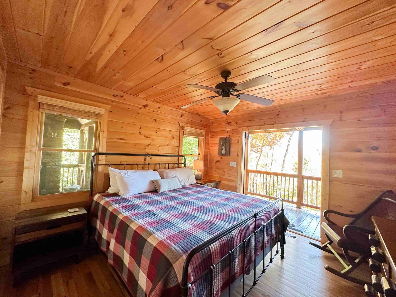 • Main level bedroom with a king bed, 42” Smart TV, and a cozy rocker on the deck.