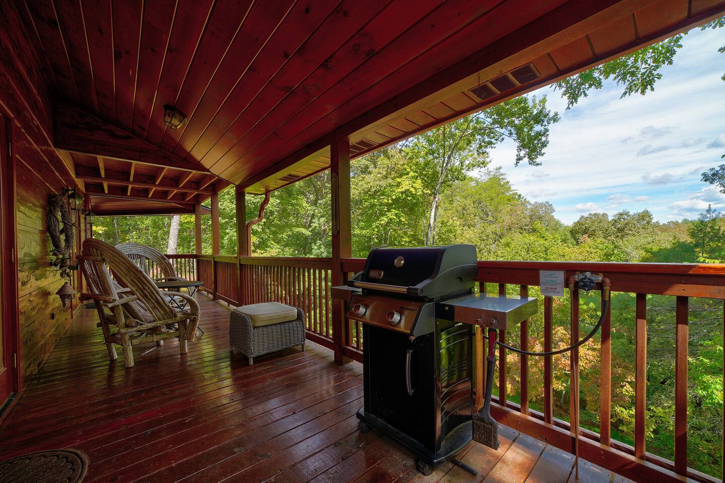 • Gas grill, grape vine chairs, and wicker patio furniture on the covered decks.