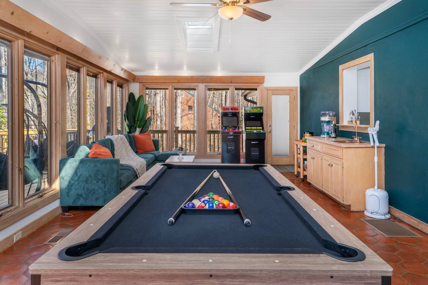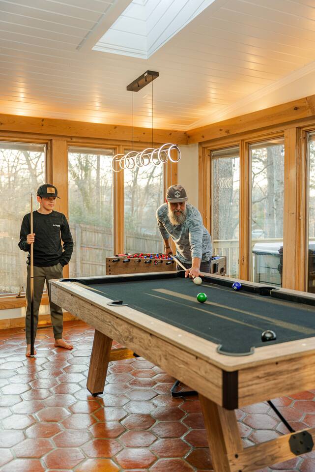 This riverfront escape is 10 min to downtown Greenville, 30 min to Clemson, and packed with fun! Enjoy 2 master suites, a bunk room, game room (pool table, arcade, karaoke), hot tub, Sauna, cold plunge firepit, outdoor kitchen, movie screen, kayaks, and more. Close to Falls Park, PKL Pickleball, Paris Mountain & dining. Perfect for families, groups & game-day stays. Launch kayaks right from your home. Book now for the ultimate getaway!