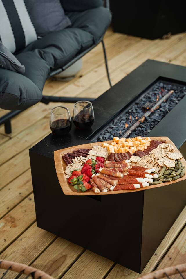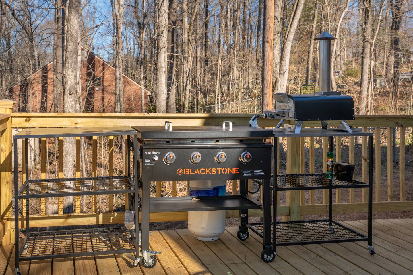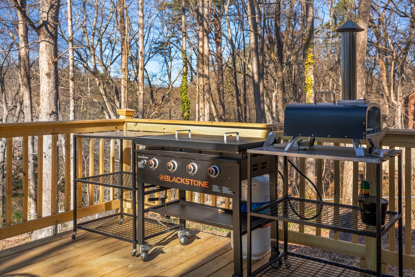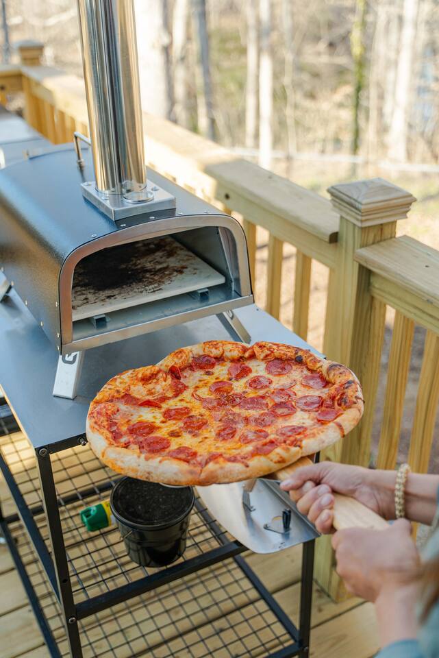 Spacious Deck with propane firepit for conveince & Outdoor Kitchen: Blackstone & Pizza Oven 🍕