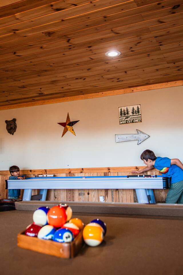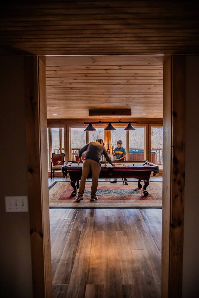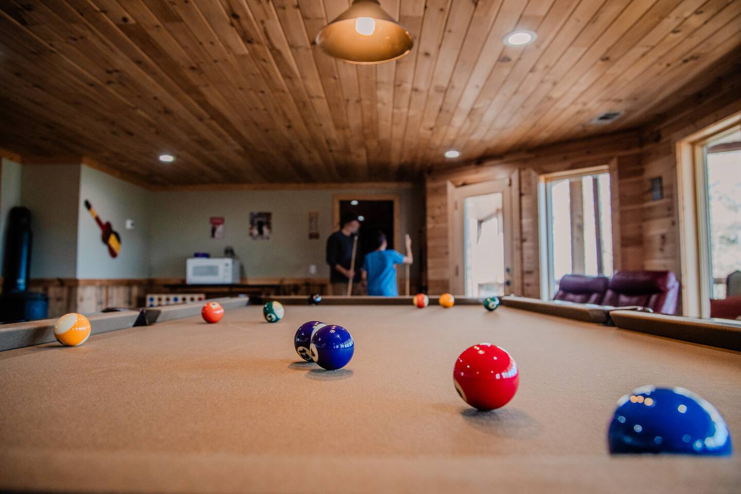 • Game Room with pool table, 55” Smart TV, and plush sectional sofa.