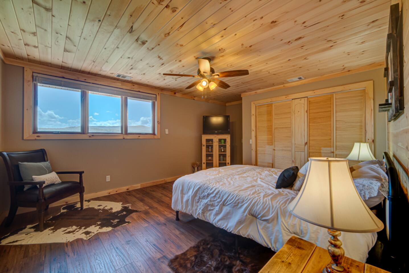 -main level master bedroom, king bed, 40” Smart Roku TV, dresser, night stands, ceiling fan